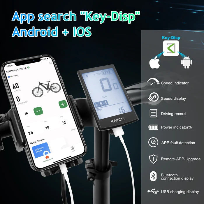 The display adopts integrated panel design, high-brightness LCD screen, more convenient to operate; the buttons are easy to operate and clearly visible even in bright light; it provides information such as speed, mileage and power; the USB function can charge the mobile phone at any time, comes with Bluetooth, supports Android and IOS systems, and can be operated remotely.